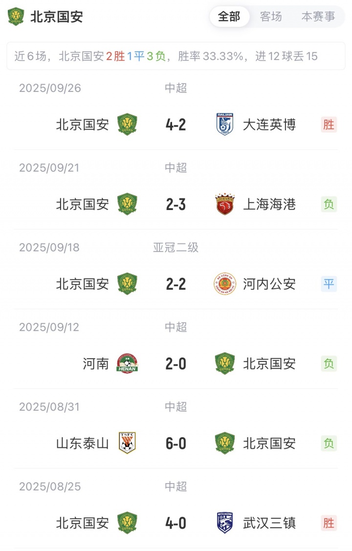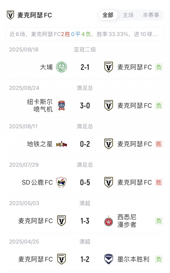 国安与麦克阿瑟此前还未交手过,双方近6场比赛战绩如下: