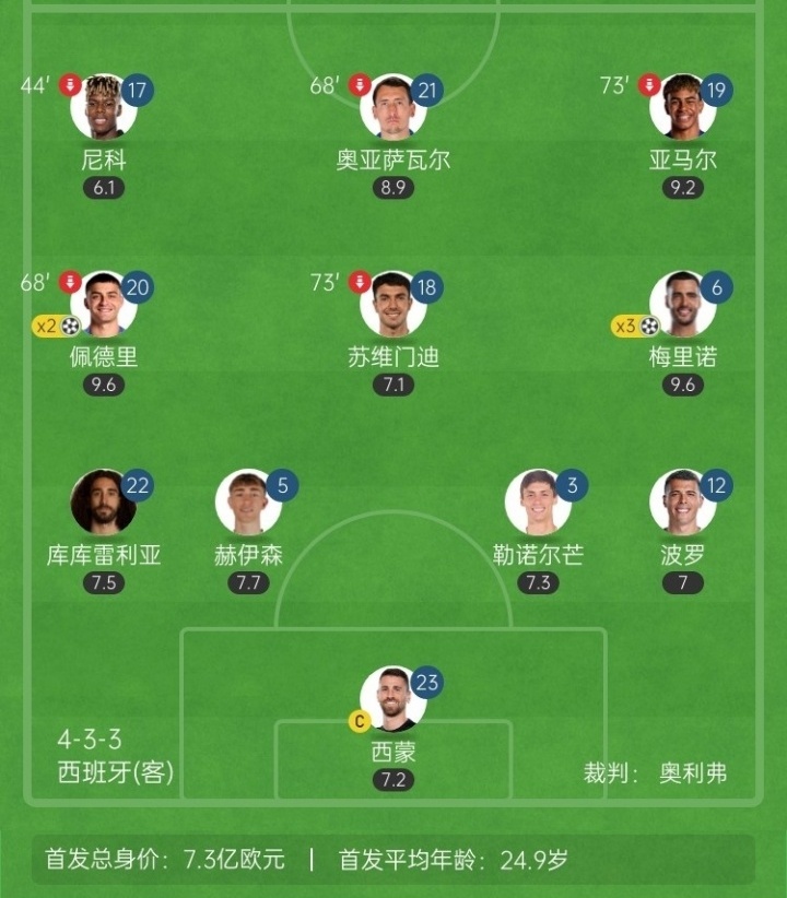 西班牙的首发11人4人来自英超,7人来自西甲。其中皇萨3人分别是赫伊森、佩德里和亚马尔。若是算上替补席的话,皇萨还有5人:卡瓦哈尔、库巴西、费尔明、奥尔莫、费兰-托雷斯